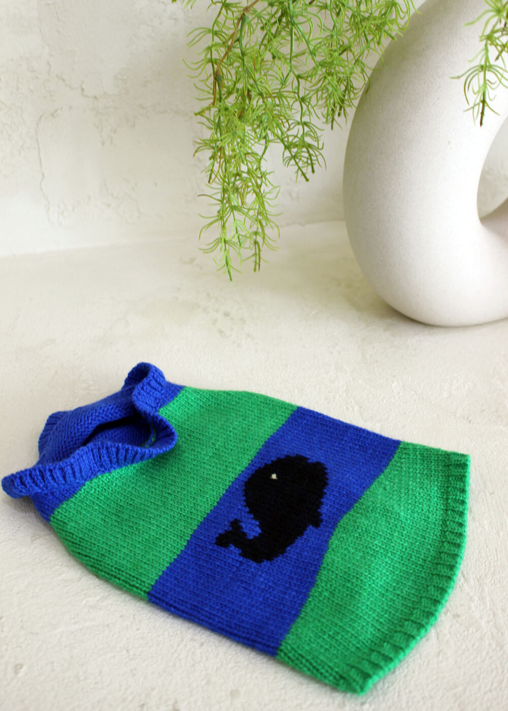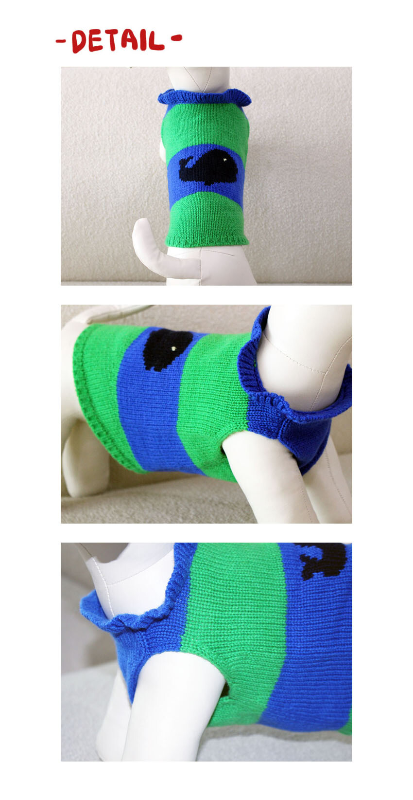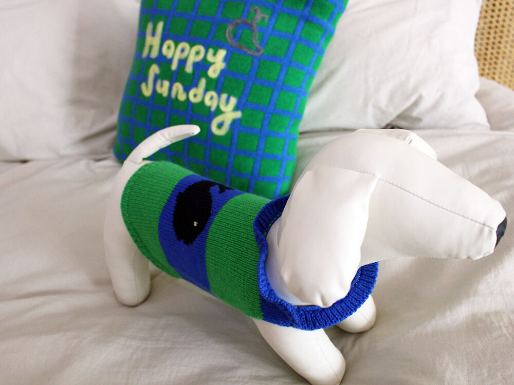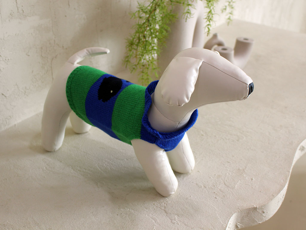 블루와 그린의 산뜻한 조화가 돋보이는 귀여운 강아지 니트입니다.