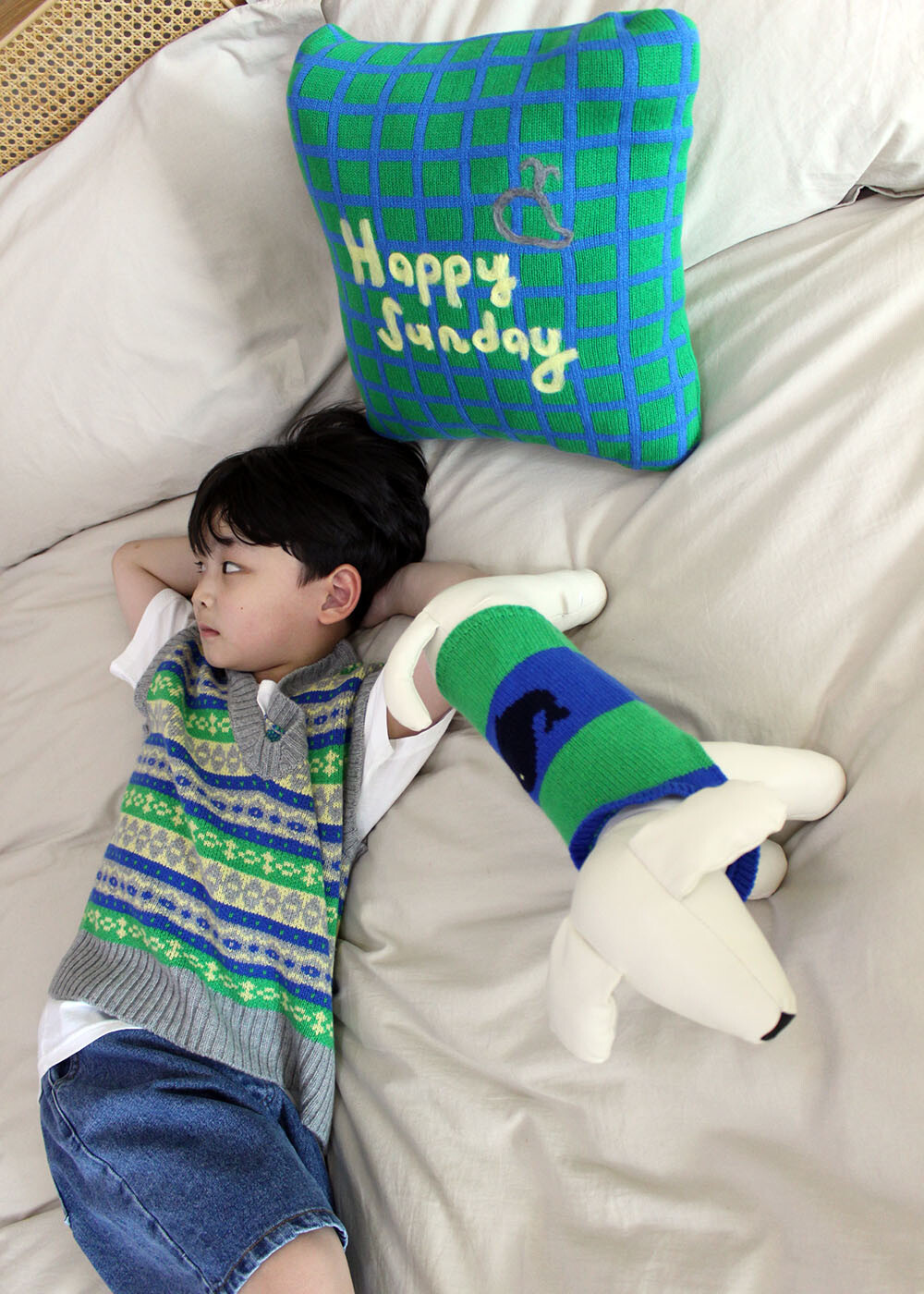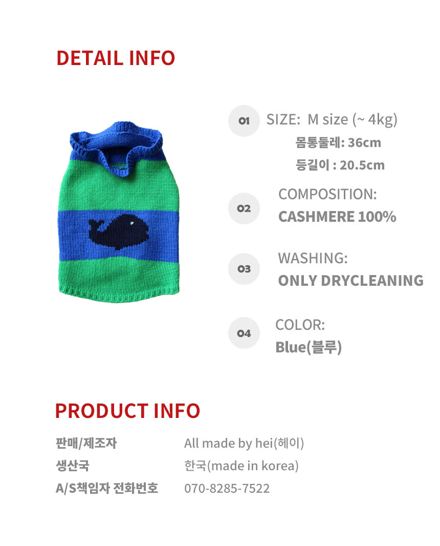 몸통에 귀여운 고래무늬를 넣었고, 캐시미어 100%로 제작되어 따뜻하고 오래 입을 수 있습니다.